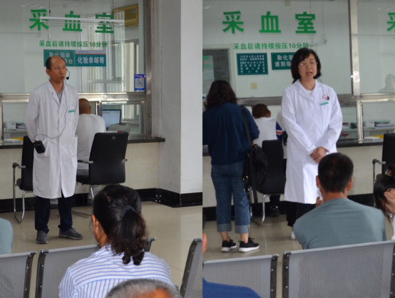 肝病一科主治医师李珊娜与肝病二科副主任医师梁晶,为门诊候诊区的患者及家属分别进行了通俗易懂的乙型肝炎和丙型肝炎知识的科普讲座。